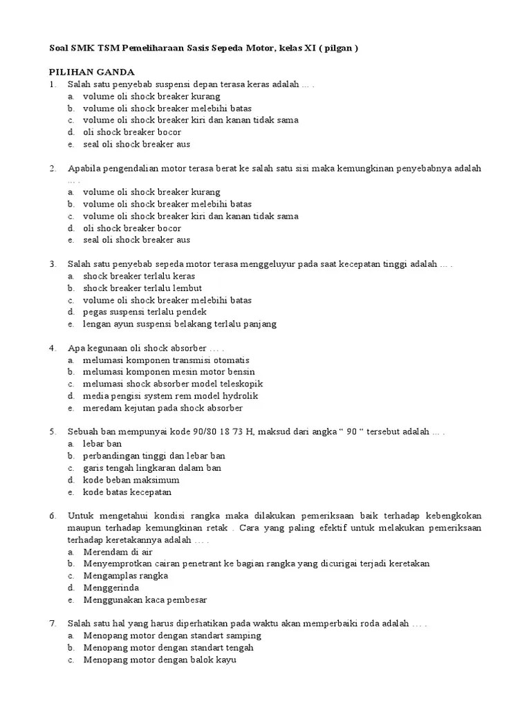 Volume oli shock breaker melebihi batas. Seal oli shock breaker aus 2. Soal smk tsm pemeliharaan sasis sepeda motor, kelas xi ( pilgan ) pilihan ganda 1. Apabila pengendalian motor terasa berat ke salah satu sisi, kemungkinan penyebabnya. Soal smk tsm pemeliharaan sasis sepeda motor, kelas xi ( pilgan ) pilihan ganda 1.